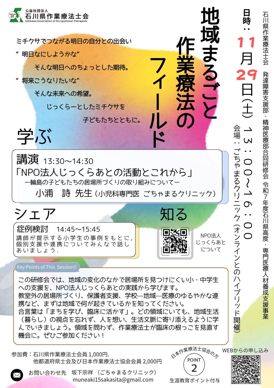 詳細ページのリンクURL:https://www.ishikawa-ot.or.jp/event/2025%e5%b9%b411%e6%9c%8829%e6%97%a5-%e7%99%ba%e9%81%94%e9%9a%9c%e5%ae%b3%e6%94%af%e6%8f%b4%e9%83%a8%e3%83%bb%e7%b2%be%e7%a5%9e%e5%8c%bb%e7%99%82%e9%83%a8%e5%90%88%e5%90%8c%e7%a0%94%e4%bf%ae%e4%bc%9a/