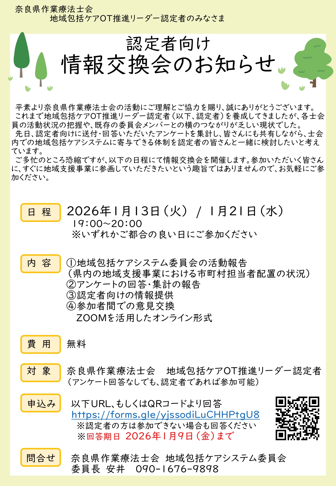 奈良県作業療法士会 地域包括ケアOT推進リーダー認定者情報交換会のお知らせ